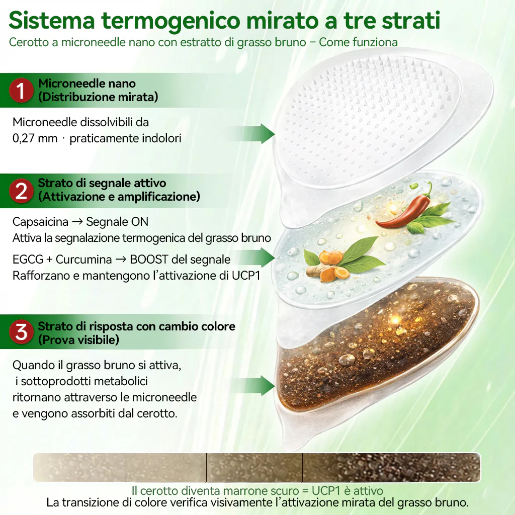 Nano-microneedle ultra-sottili rilasciano i composti attivi direttamente nei tessuti di grasso bruno adiacenti alla pelle, evitando le perdite digestive e il sovraccarico sistemico. Una volta rilasciati, la capsaicina avvia la segnalazione termogenica, mentre EGCG e curcumina amplificano e stabilizzano lโattivitร di UCP1, supportando una termogenesi sostenuta senza brividi e una dissipazione efficiente dellโenergia.