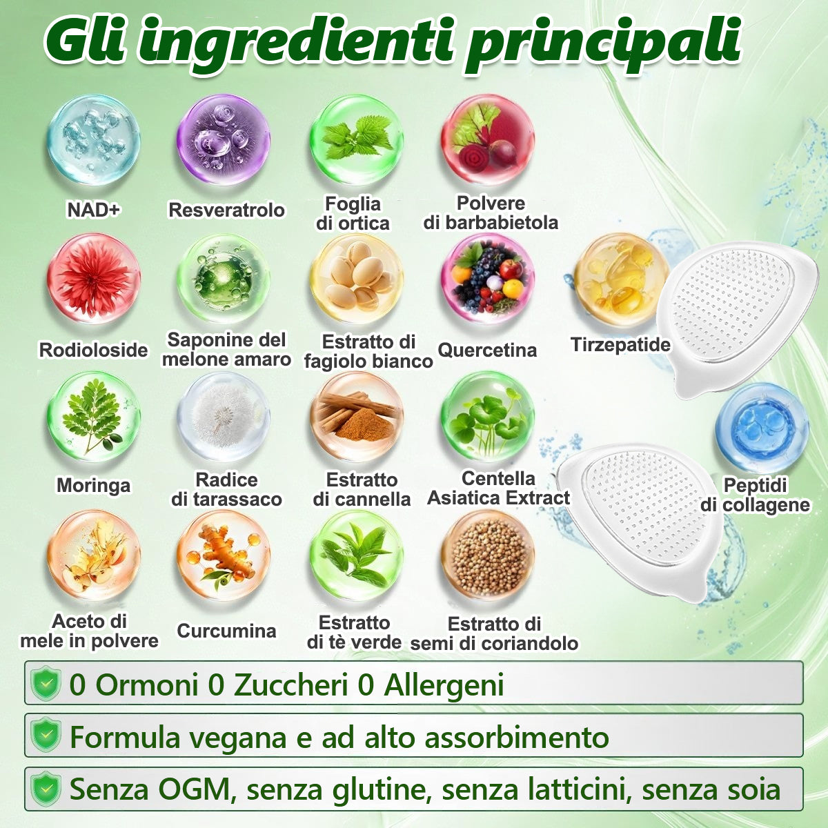 Questa formula 100% naturale e di origine vegetale รจ scientificamente progettata per agire in armonia con il corpo e puรฒ essere utilizzata in sicurezza insieme ad altri farmaci o alimenti. ร adatta ai vegani e altamente assorbibile, priva di ormoni, solfati e allergeni comuni, e non contiene metalli pesanti, olio minerale nรฉ ingredienti solari cancerogeni. ร inoltre senza coloranti artificiali, fragranze e conservanti.